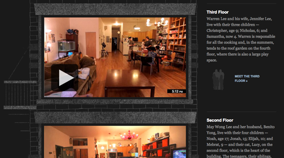 A sweet and simple bit of interactive storytelling that reveals not just a day in the life of three generations of a single family in New York City’s Chinatown, but nicely illustrates the humanity behind reams of census data that often goes overlooked. In this case, 10 percent of NYC residents live with multiple generations under one roof, a trend mirrored in the rest of the country.