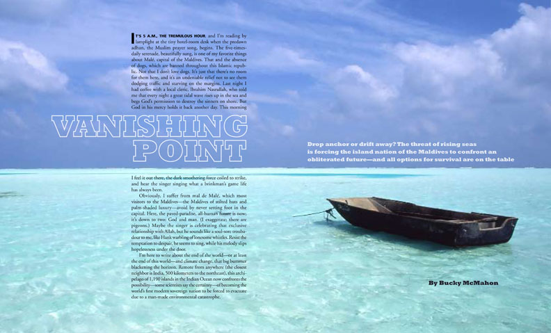I’m here to write about the end of the world—or at least the end of this world—and climate change, that big bummer blackening the horizon. Remote from anywhere (the closest neighbor is India, 500 kilometers to the northeast), this archipelago of 1,190 islands in the Indian Ocean now confronts the possibility—some scientists say the certainty—of becoming the world’s first modern sovereign nation to be forced to evacuate due to a man-made environmental catastrophe.