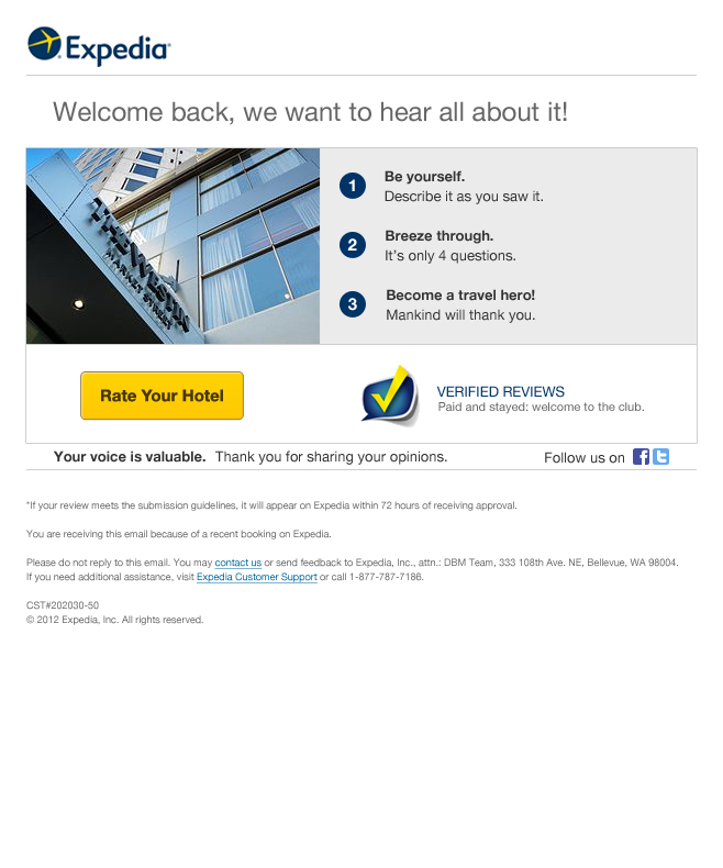 User Review Email Posted on December 4, 2012 Updated design and messaging for user hotel reviews for all global POS. Received just under 4 million hotel guest reviews in 13 native languages and attained a 15% submission rate. Share this: Click to share on X (Opens in new window) X Click to share on Facebook (Opens in new window) Facebook Like Loading... Related