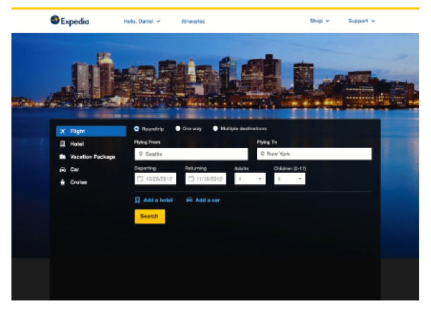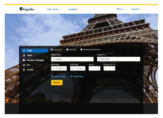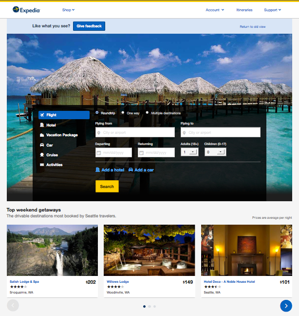 Expedia’s current opt-in homepage is testing both a new page UI as well as enhanced wizard/search functionality (IP sniff, type-ahead, section headings). Anchoring the page with an image that is highly engaging and experiential in nature focuses the user on the task of entering key dates and location for a trip so we can surface those options more quickly and effectively.