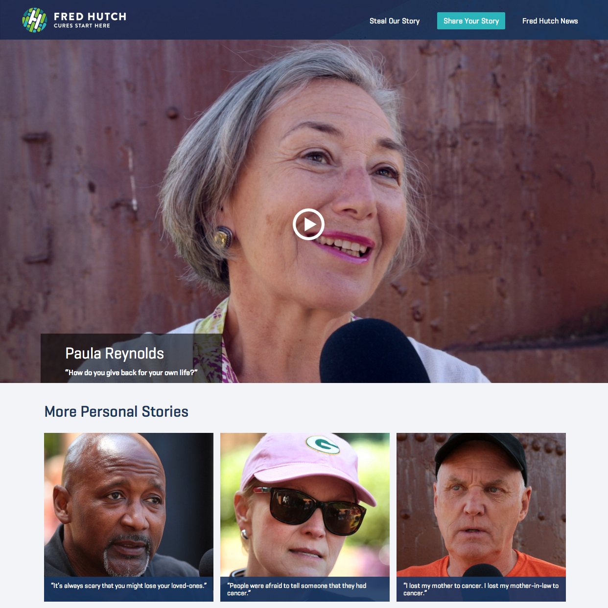 Share Your Story Posted on December 9, 2014 We created this storytelling/story-sharing prototype for cancer survivors and caregivers to feature photos, videos and first-person narratives into a single microsite (targeted launch Q1/2015). Project goal: Build community and resources specifically for this audience while raising awareness about clinical trials/new treatments in the pipeline at Fred Hutch. One thing to note: while these initial interviews were collected by our team via first-person Q&As, the intention is also to have stories posted here that have been created and submitted by patients, doctors/researchers or anyone who has been impacted by cancer. Share this: Click to share on X (Opens in new window) X Click to share on Facebook (Opens in new window) Facebook Like Loading... Related