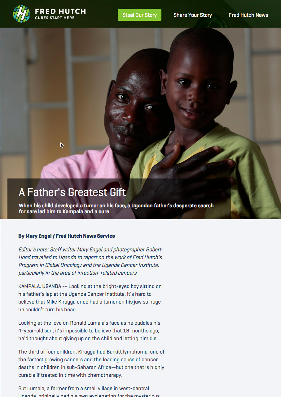 A companion UI in the ‘Share Your Story’ prototype, this functionality and ‘steal’ call to action is intended to be used on the public site homepage and News blog to encourage free and easy distribution of original content as part of the Fred Hutch News Service. This page is designed not only as a showcase of our stories, but the hover state reveals an icon to signal the images and story are available to repost.